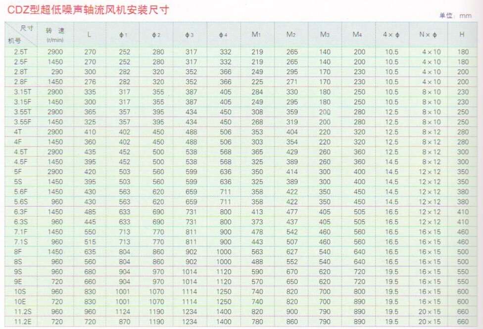 CDZ系列超低噪聲軸流風(fēng)機(jī)是高效、節(jié)能、超低噪聲的新型軸流風(fēng)機(jī)。該風(fēng)機(jī)具備T35-11軸流風(fēng)機(jī)的所有特點(diǎn),通過模型機(jī)的試驗證明,由于采用了寬型前掠式葉片等柵距結(jié)構(gòu),減少了氣流在葉片表面上的分禽和氣流旋渦的形成。降低了風(fēng)機(jī)內(nèi)氣流的二次損耗,減少了聲源的空氣動力噪聲,氣流穩(wěn)定,達(dá)到了國家規(guī)定的超低噪聲水準(zhǔn)。對保護(hù)環(huán)境,節(jié)約能源,具有很好的社會與經(jīng)濟(jì)效益。CDR系列超低噪聲軸流風(fēng)機(jī)全部選用優(yōu)質(zhì)鋼材制造.外型結(jié)構(gòu)分為管道式、固定式、旋轉(zhuǎn)式三種,根據(jù)不同風(fēng)量、風(fēng)壓的需要葉片的安裝角度分為A. B. C三個年度(詳見性能參數(shù)表)