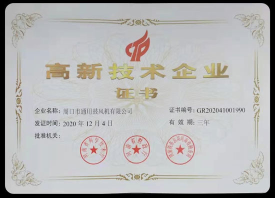 2020年12月4日,經(jīng)國家稅務(wù)總局河南省稅務(wù)局、河南省財政廳、河南省科學(xué)技術(shù)廳認真評審,周口市通用鼓風(fēng)機有限公司順利榮獲“高新技術(shù)企業(yè)”證書。這是政府及社會各界對公司的認可,我們將以此為動力,努力的打造"周口風(fēng)機”品牌,生產(chǎn)出更好的產(chǎn)品來回饋客戶!